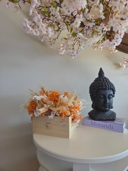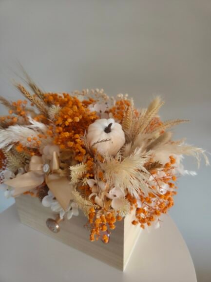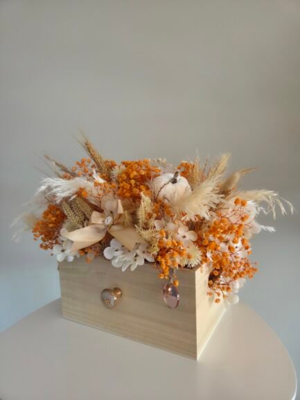 Celebrate autumn with our charming mix of dried and high-quality artificial flowers. Each arrangement comes in a rustic wooden “drawer” box, bringing cozy seasonal colors into your home—perfect for centerpieces, décor, or thoughtful gifts.