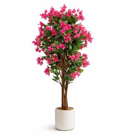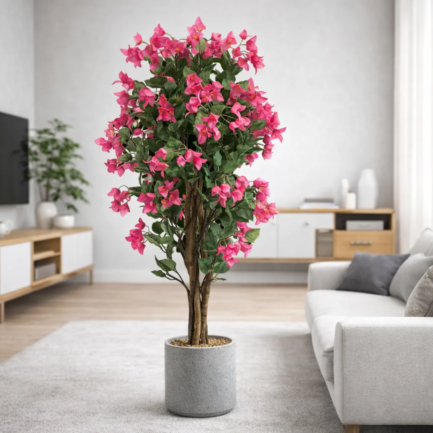 The artificial pink bougainvillea tree is a striking interior feature that brings a fresh, spring-like atmosphere throughout the year. It is hand-crafted using a real tree trunk and high-quality artificial flowers, ensuring a natural and elegant appearance. The tree is supplied in a durable plastic base pot for easy placement.