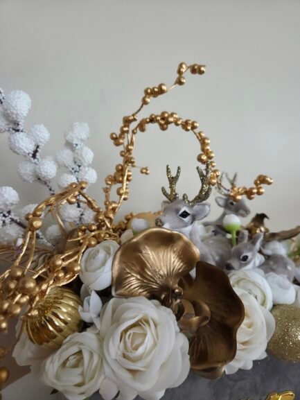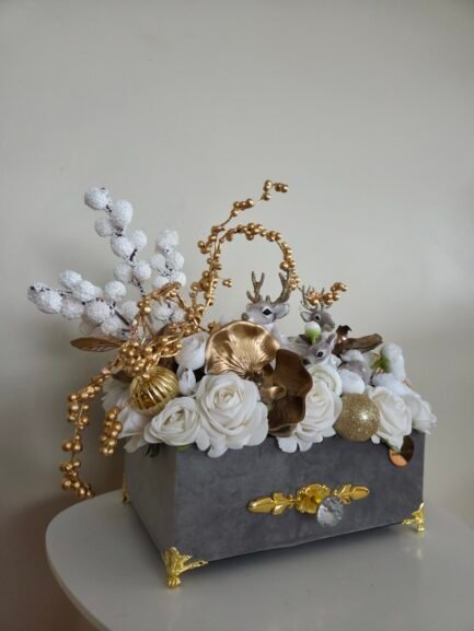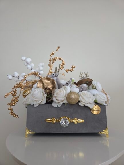 Celebrate the magic of the season with our Deer Family Story arrangement — a luxurious artificial flower display presented in an elegant velvet box. This exquisite piece features a harmonious blend of white roses, golden accents, and charming deer figurines, capturing the warmth and wonder of Christmas.