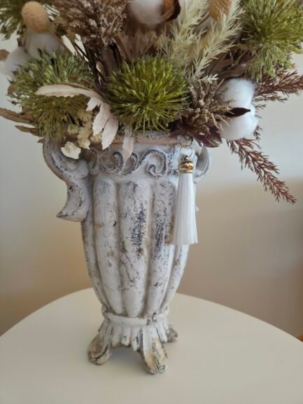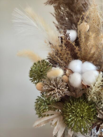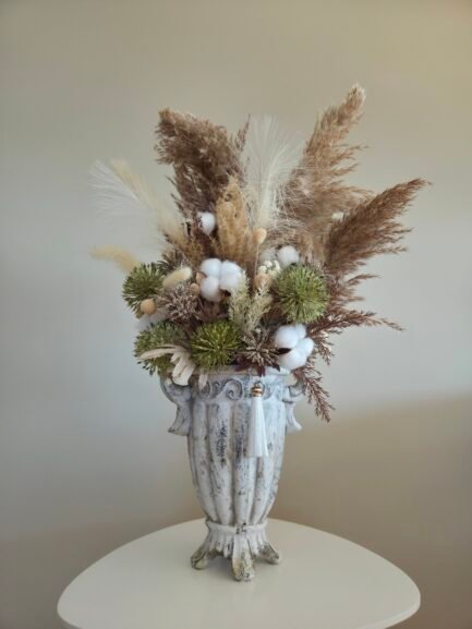 Embrace the beauty of autumn with our elegant floral composition, featuring a harmonious mix of dried and premium artificial flowers. Arranged in a vintage-inspired ceramic vase, this piece captures the rich colors and textures of the season, bringing timeless charm to any space.