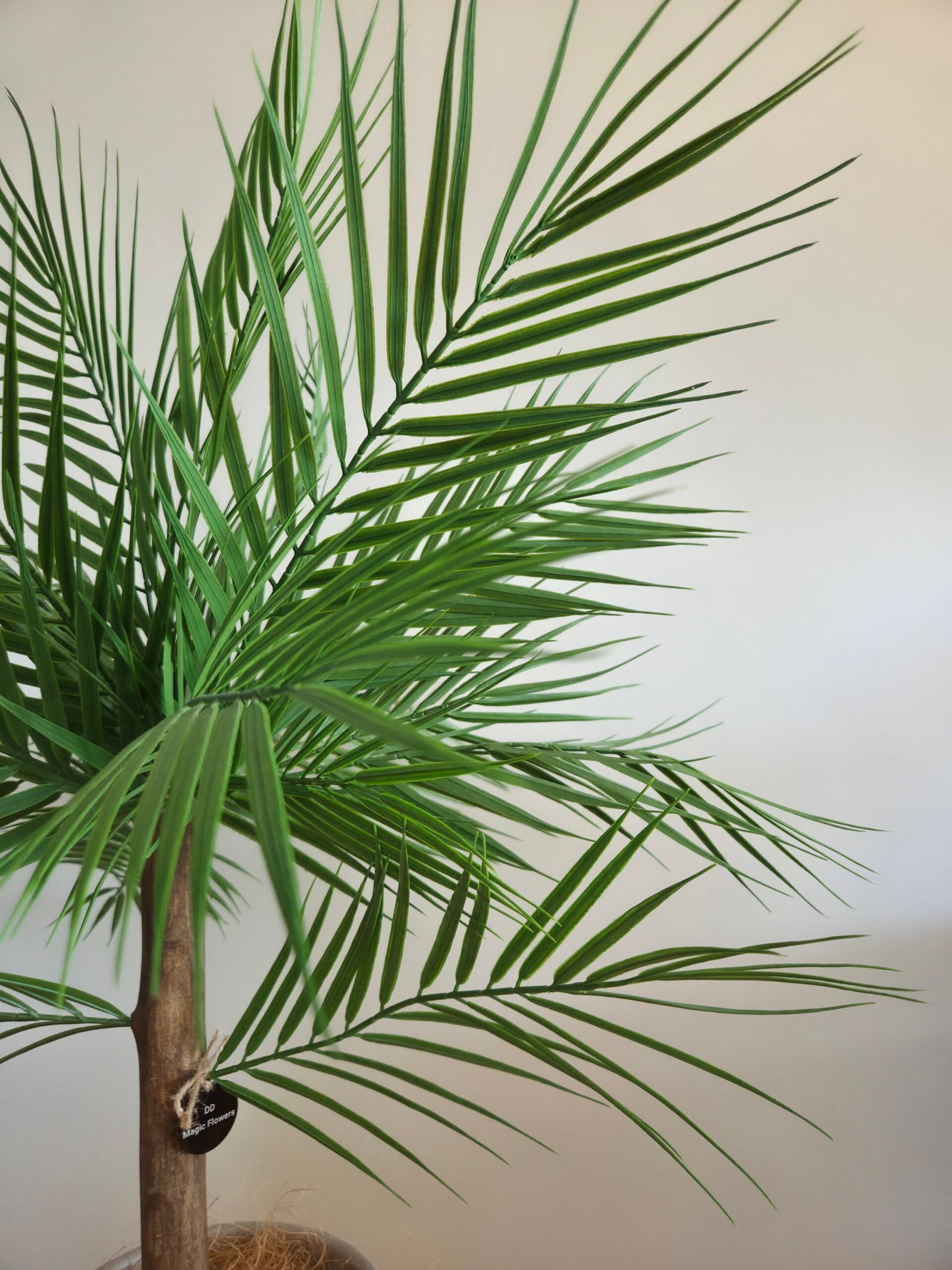 A beautifully handcrafted 80cm tall artificial palm tree, featuring a genuine tree trunk paired with realistic artificial leaves. Presented in an elegant ceramic pot, this piece brings exotic touch to any space