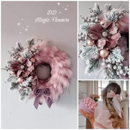 Add a touch of winter luxury to your festive décor with this soft faux fur wreath 50cm, beautifully adorned with pink flower, silver ornaments, frost pine branches and pastel accents. Finished with a crystal charm, it brings cozy elegance and sparkle to any space this holiday season.