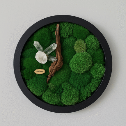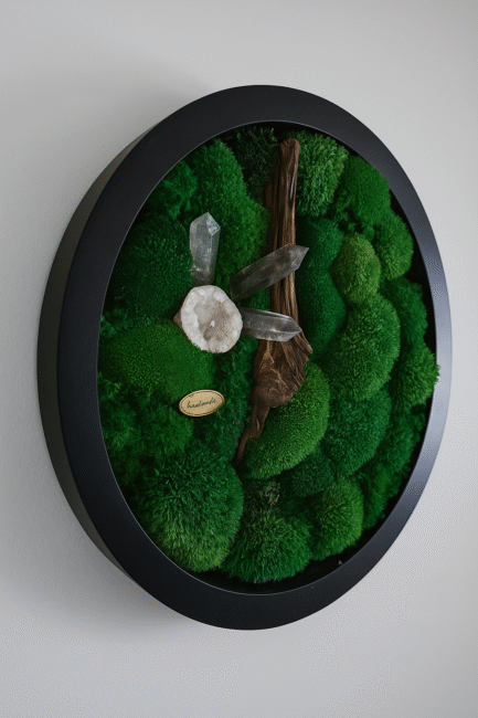 Delicately adorned with natural crystals, these artworks create a subtle connection between earth and spirit — blending the grounding energy of moss with the healing vibrations of crystals. The result is a timeless fusion of natural beauty and spiritual balance, perfect for homes, offices, or wellness spaces.