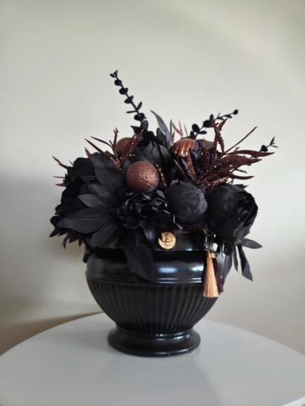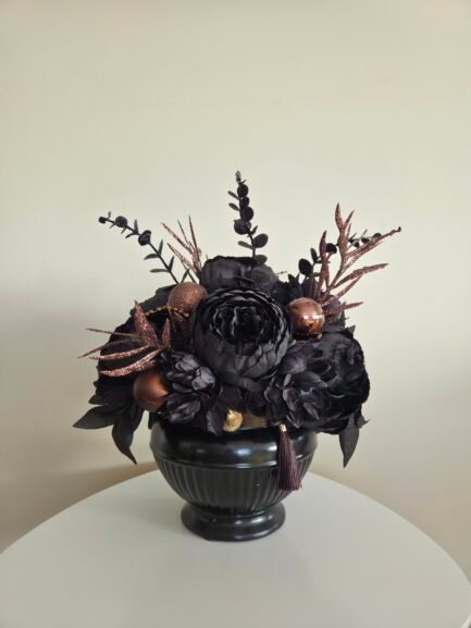 A stunning, handcrafted centerpiece crafted with high-quality artificial flowers. This elegant arrangement in black ceramic vase is designed to bring a touch of sophistication and seasonal charm to your holiday décor.