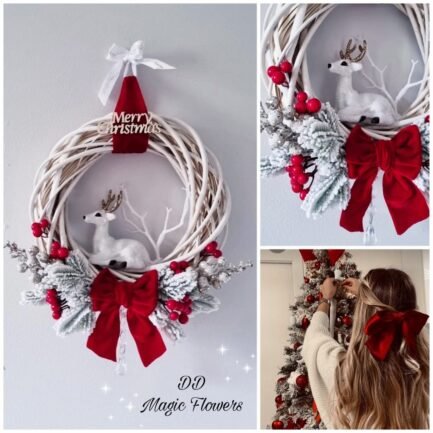 Add a touch of winter luxury to your festive décor with this hand made 30cm Christmas wreath, beautifully adorned with red accents, frost pine branches, velvet ribbon and cute raindeer in the middle. Finished with a crystal charm, it brings cozy elegance and sparkle to any space this holiday season.