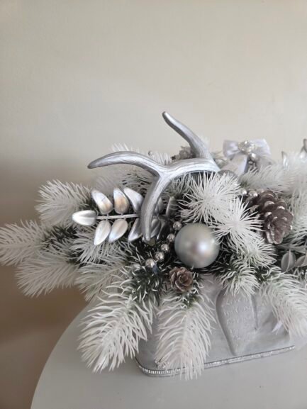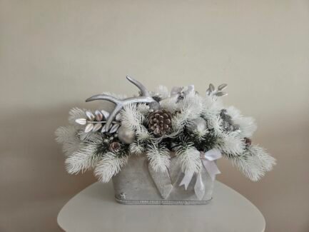 Bring a touch of refined winter beauty into your home with our Winter Elegance Christmas Floral Arrangement in heavy stone vase. This exquisite piece features frosted pine branches, natural pinecones, and metallic silver accents, perfectly capturing the serene charm of a snowy holiday landscape.
